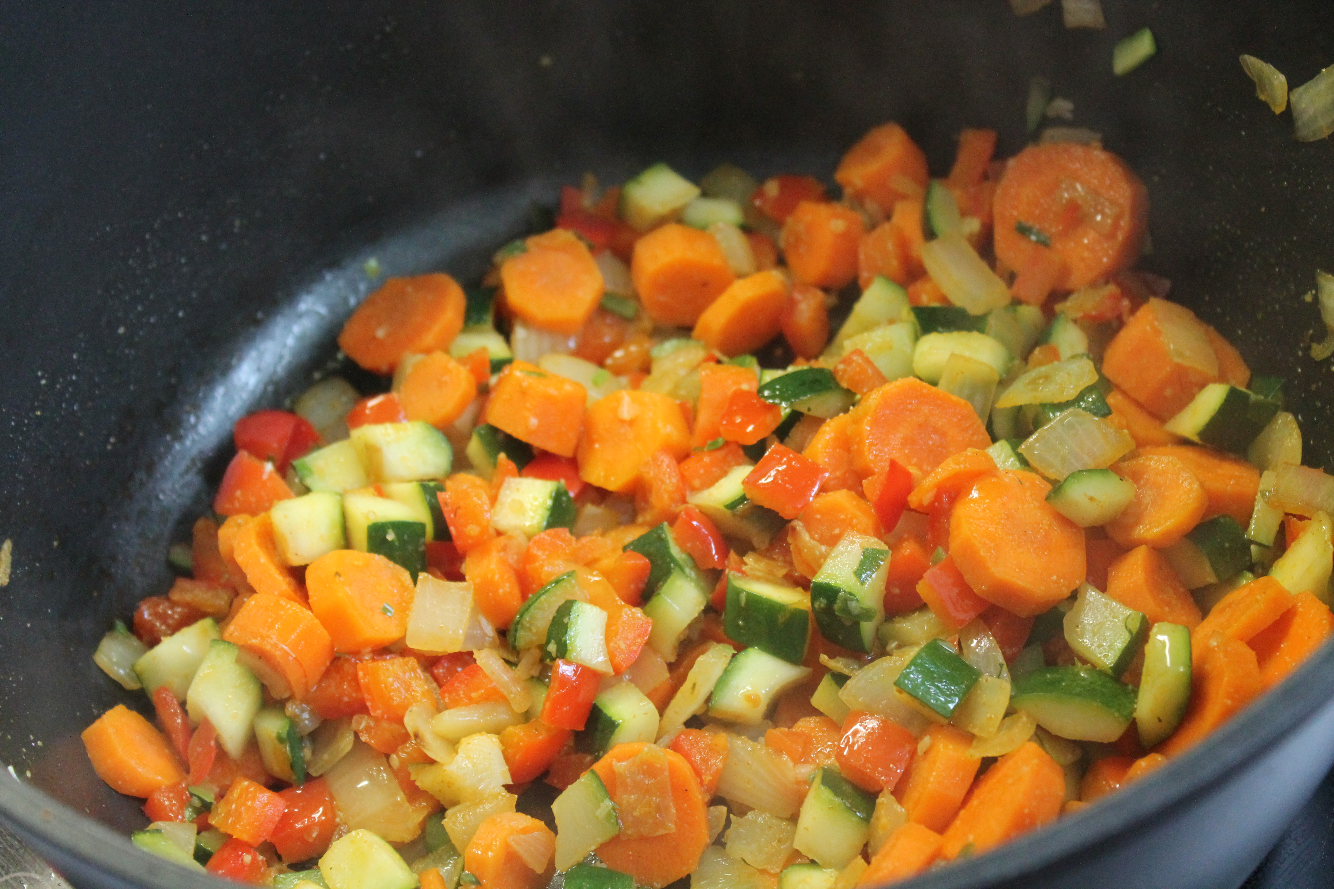 Zwiebel schneiden und im Wok mit Olivenöl erhitzen bis sie glasig sind. Paprika, Zucchini und Möhren klein schneiden und dazugeben, sobald die Zwiebeln glasig sind.