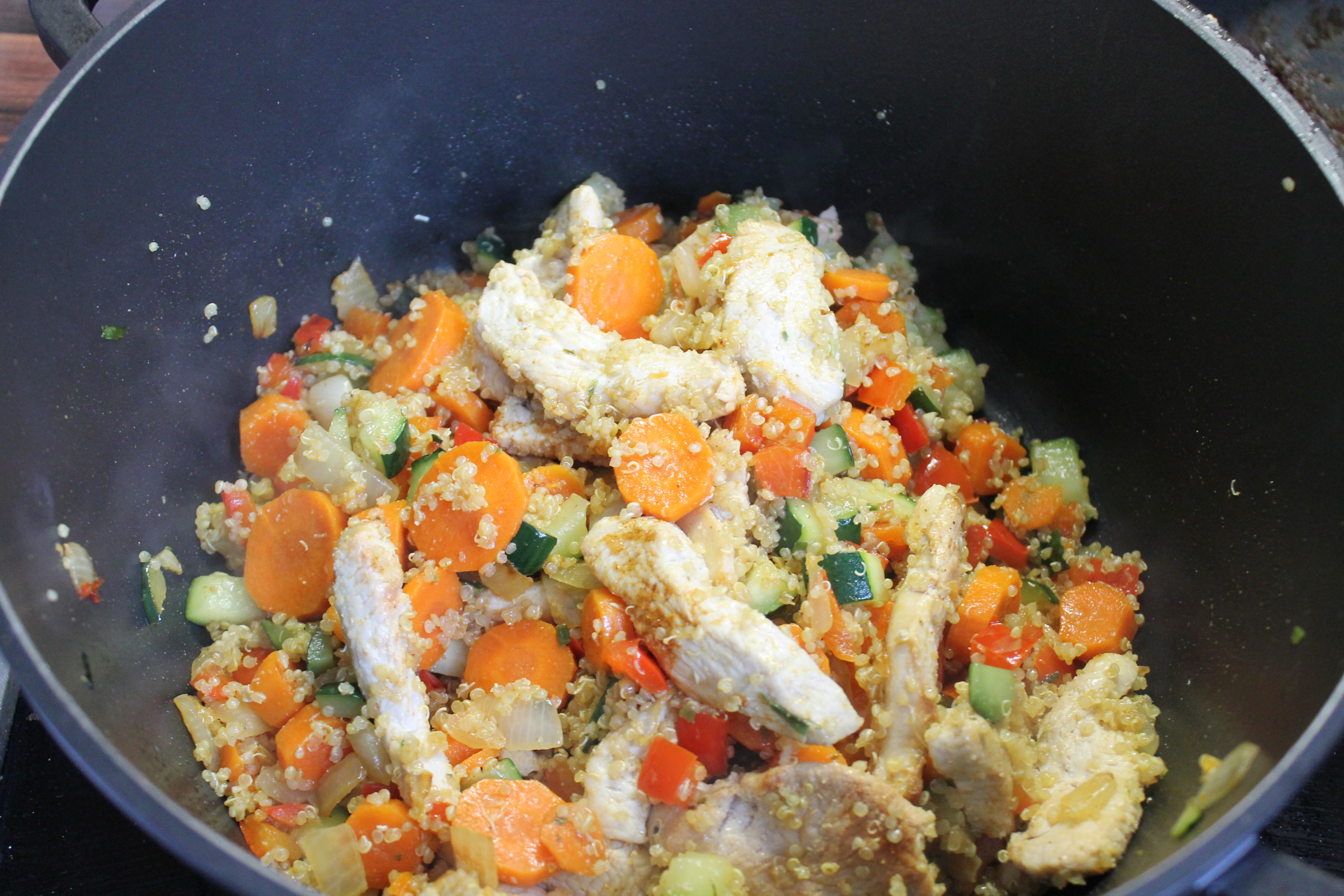 Einen Schuss Kokos-Curry-Öl hinzugeben und alles bei mittlerer Hitze erhitzen. Jetzt ist es Zeit zum Würzen. Salz, Pfeffer, Knoblauch, ein bisschen Curry und ein extra Asia-Wok-Gewürz habe ich benutzt, bleibt euch aber offen was ihr verwendet. Sobald die Zucchini und Möhren weich werden (am besten kosten) Quinoa und Pute hinzugeben und alles nochmal 10 Minuten bei mittlere Hitze ziehen lassen, sodass sich alles gut vermischt.IMG_5227