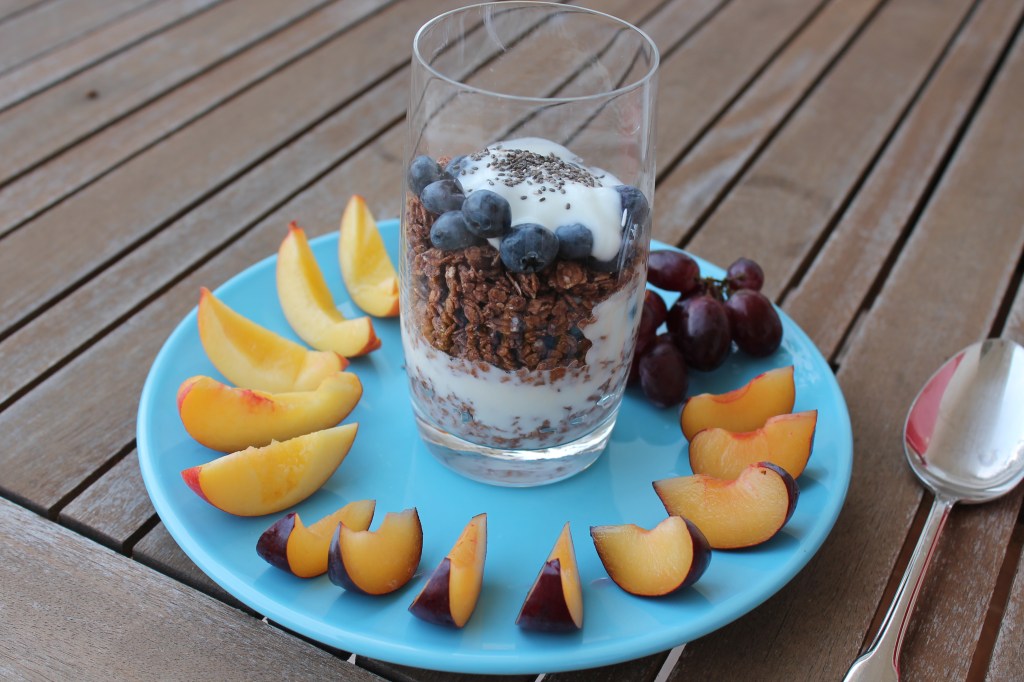today I ate granola once again. My beloved spelt crunchys with dark chocolate, yoghurt and tons of fruits! One plum, one nectarine, blueberries and grapes, on top Chia Seeds. This breakfast fills me up for a long time and is super tasty.