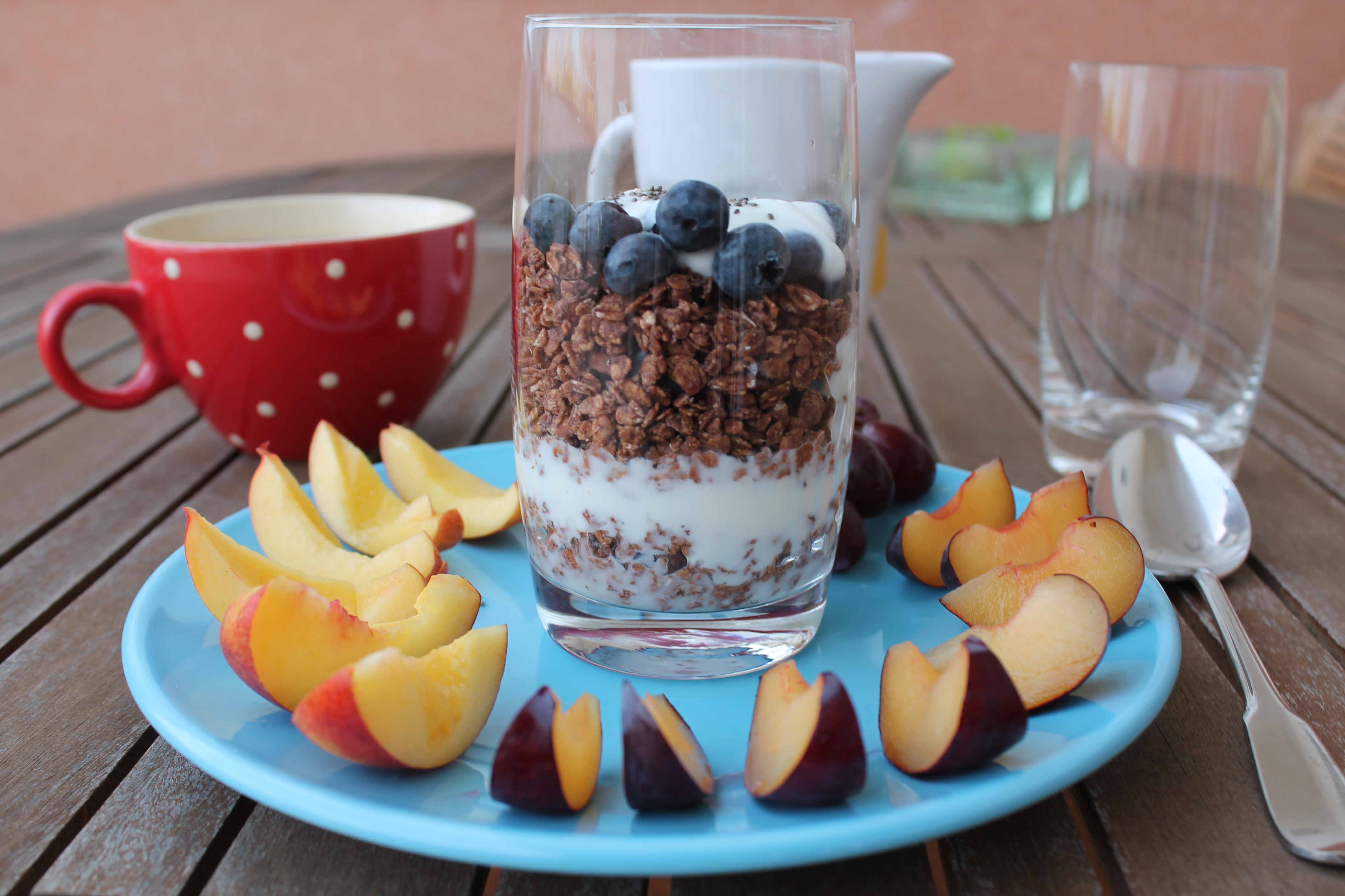 today I ate granola once again. My beloved spelt crunchys with dark chocolate, yoghurt and tons of fruits! One plum, one nectarine, blueberries and grapes, on top Chia Seeds. This breakfast fills me up for a long time and is super tasty.