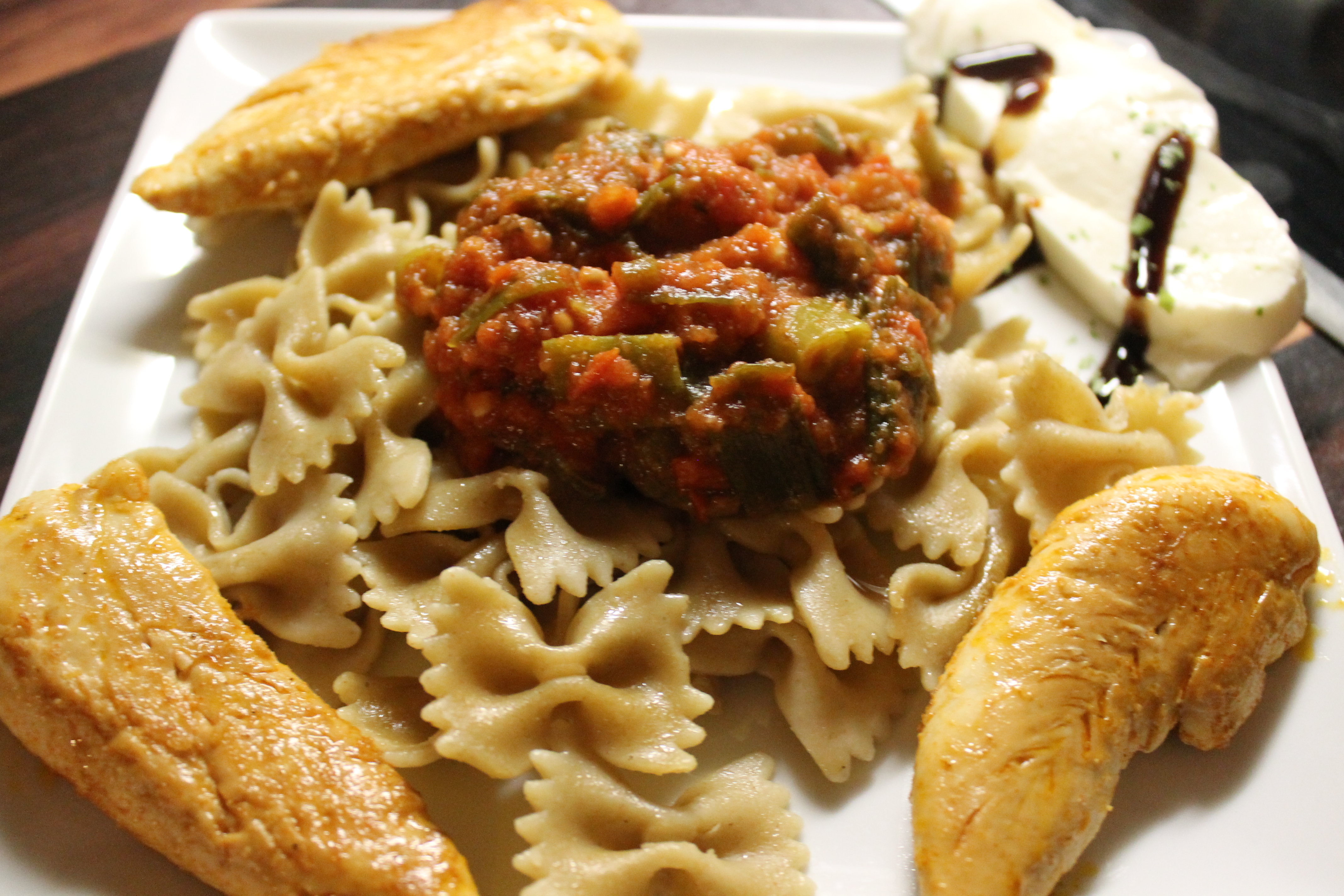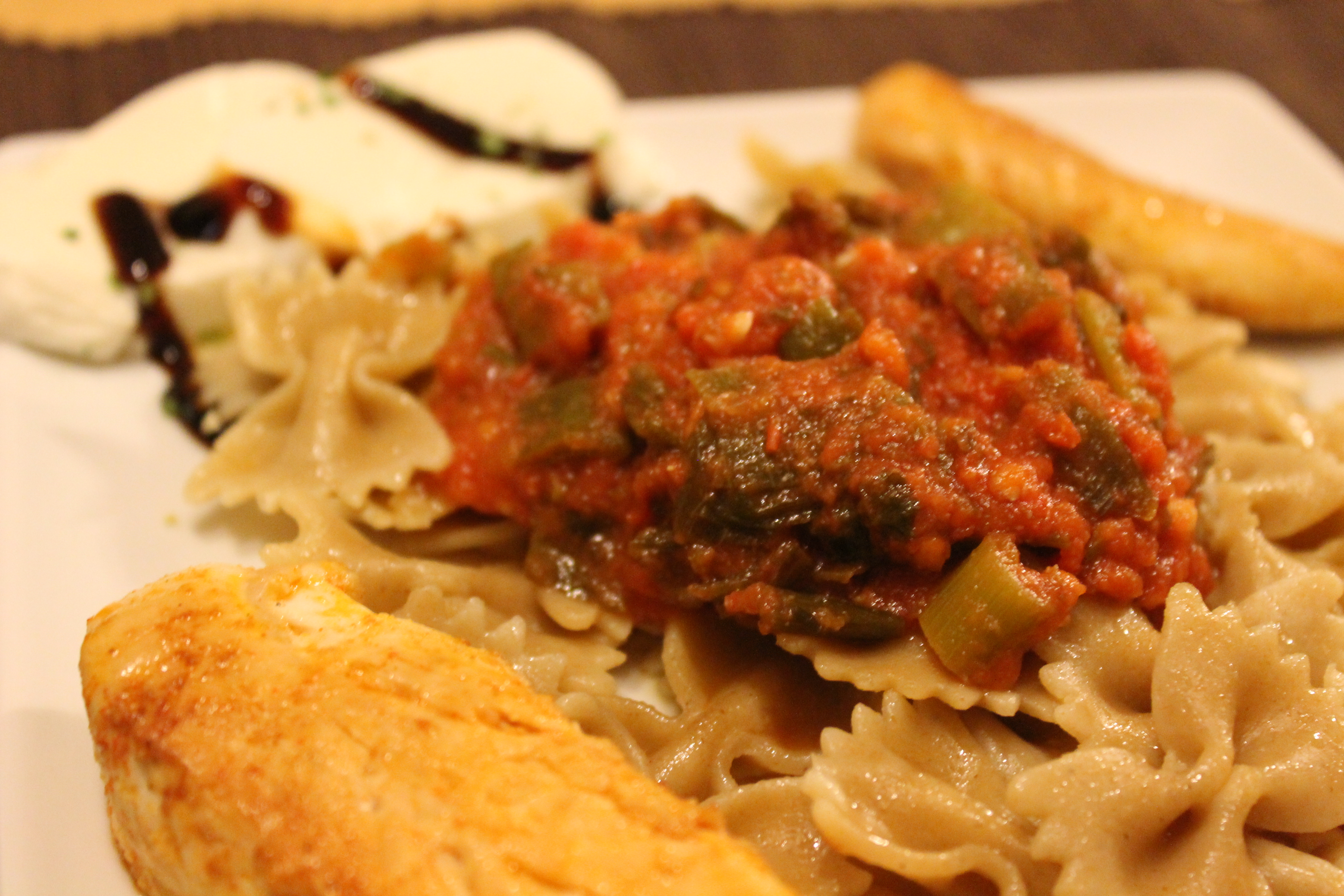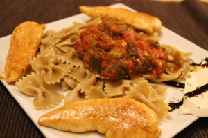 today I created something new, but I don’t know how to call it. It’s chicken with pasta and a tomatoe-escallion sauce :)And I want to present you a step-by-step recipe 🙂