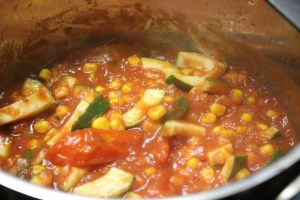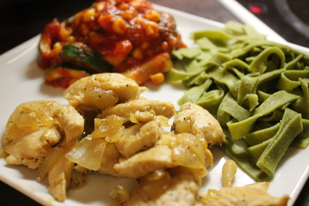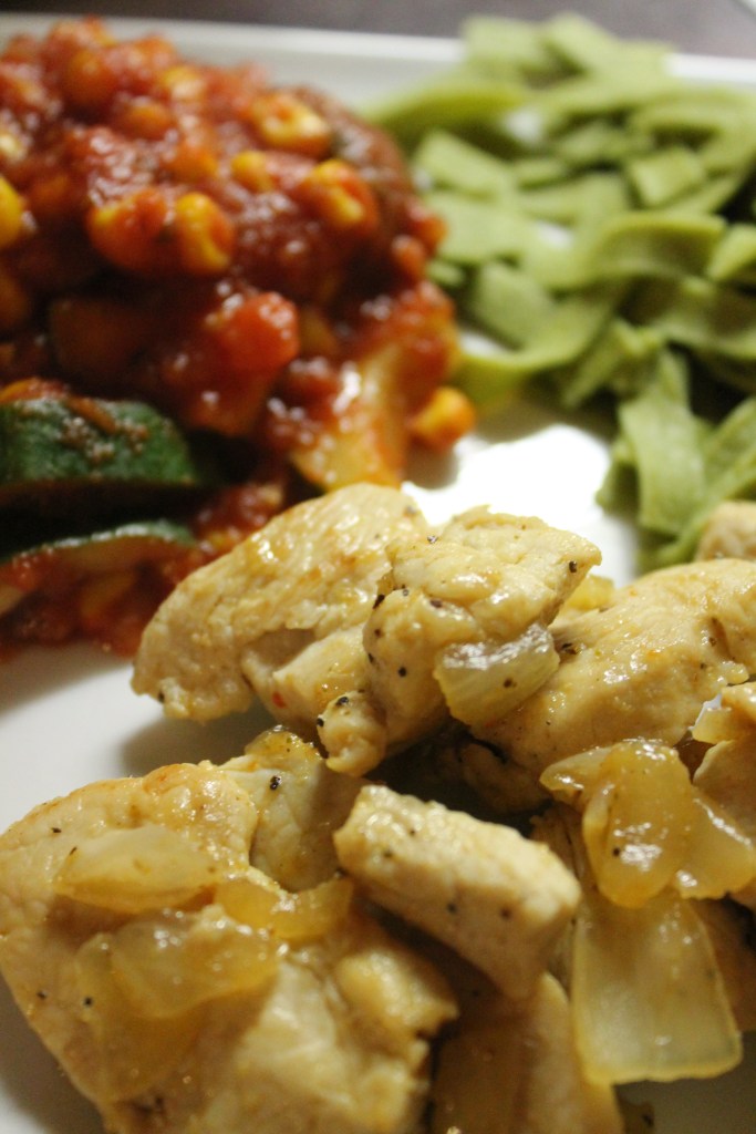 Das ist kleingeschnittene Pustenbrust mit Zwiebeln angebraten, Spinat-Nudeln und einer Soße bestehend aus Tomaten, passierten Tomaten, Mais, Zucchini und vielen Gewürzen. Warum ich das poste? Anregungen für euch, falls ihr mal nicht was ihr essen sollt. 🙂