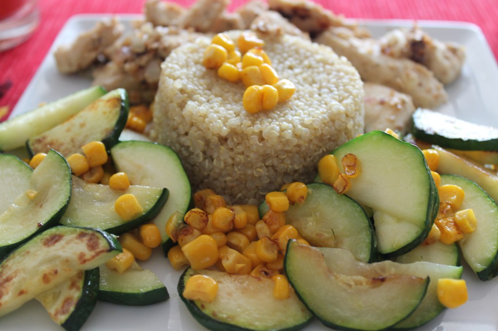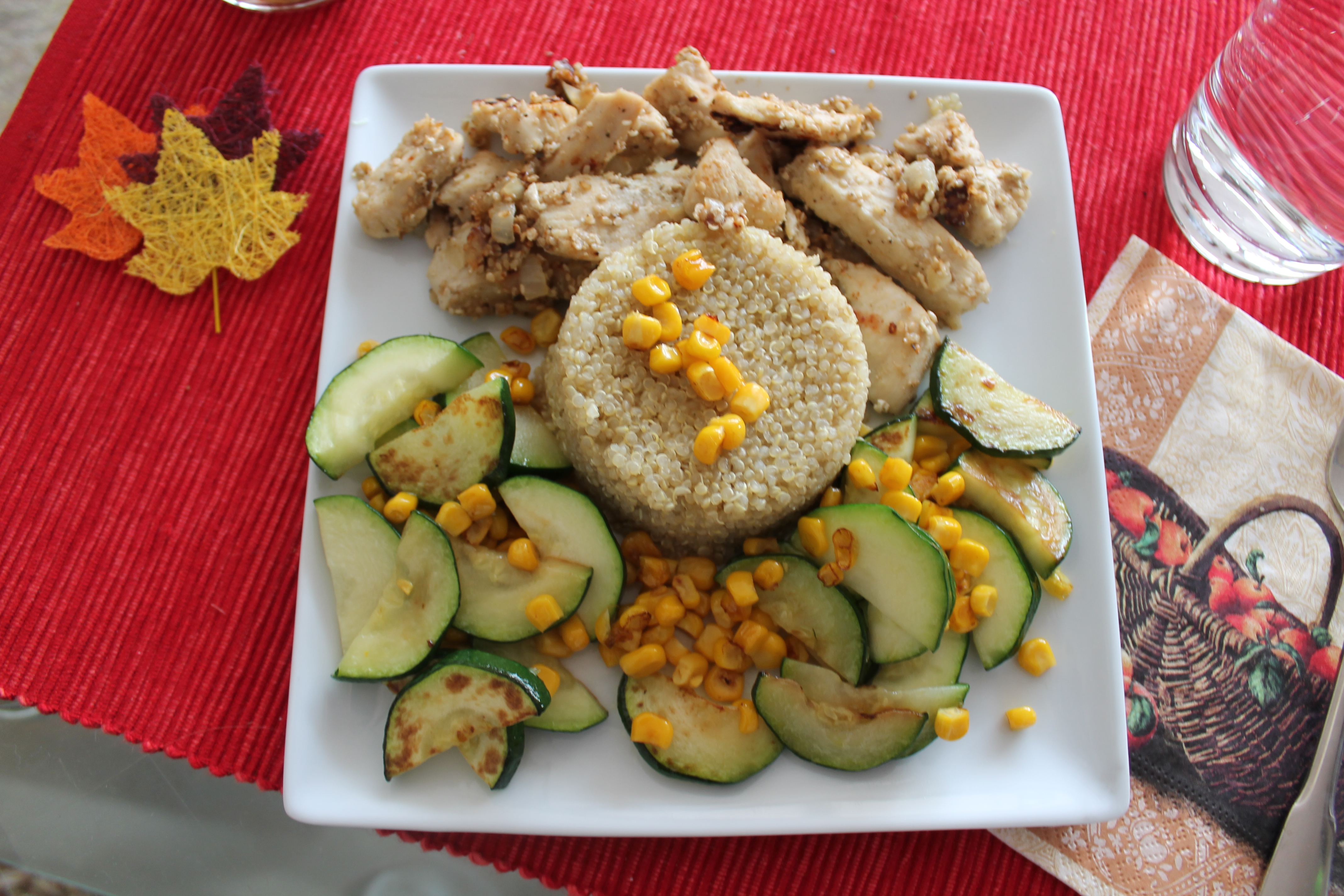 ich möchte euch teilhaben lassen an meinem super leckeren Mittagessen. Sesam-Huhn mit Quinoa und Gemüse. Ok, das beste daran ist das Sesamhuhn 🙂 Dazu habe ich einfach Sesamkörner mit einem Tropfen Olivenöl in eine Pfanne gegeben und gebraten/geröstet. Danach das Huhn dazu geben und nach Bedarf nochmal Sesam hinzugeben. Zucchini und Mais in einer anderen (beschichtenen) Pfanne braten und den Quinoa zubereiten. Servieren und genießen 🙂