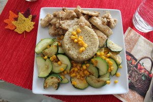 I want to share with you my delicious lunch! I had sesame chicken with quinoa and veggies. This is super easy and delicious! Just fry sesame with a drop olive oil in a non stick pan, add chicken and some more sesame. In another pan you fry zucchini and corn. Prepare the quinoa. Serve and enjoy. 🙂