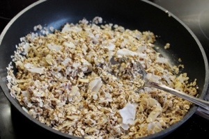 • Haferflockengemisch in die Pfanne geben und dafür sorgen, dass alles mit Öl und Sirup benetzt wird ( notfalls noch Sirup hinzugeben )
