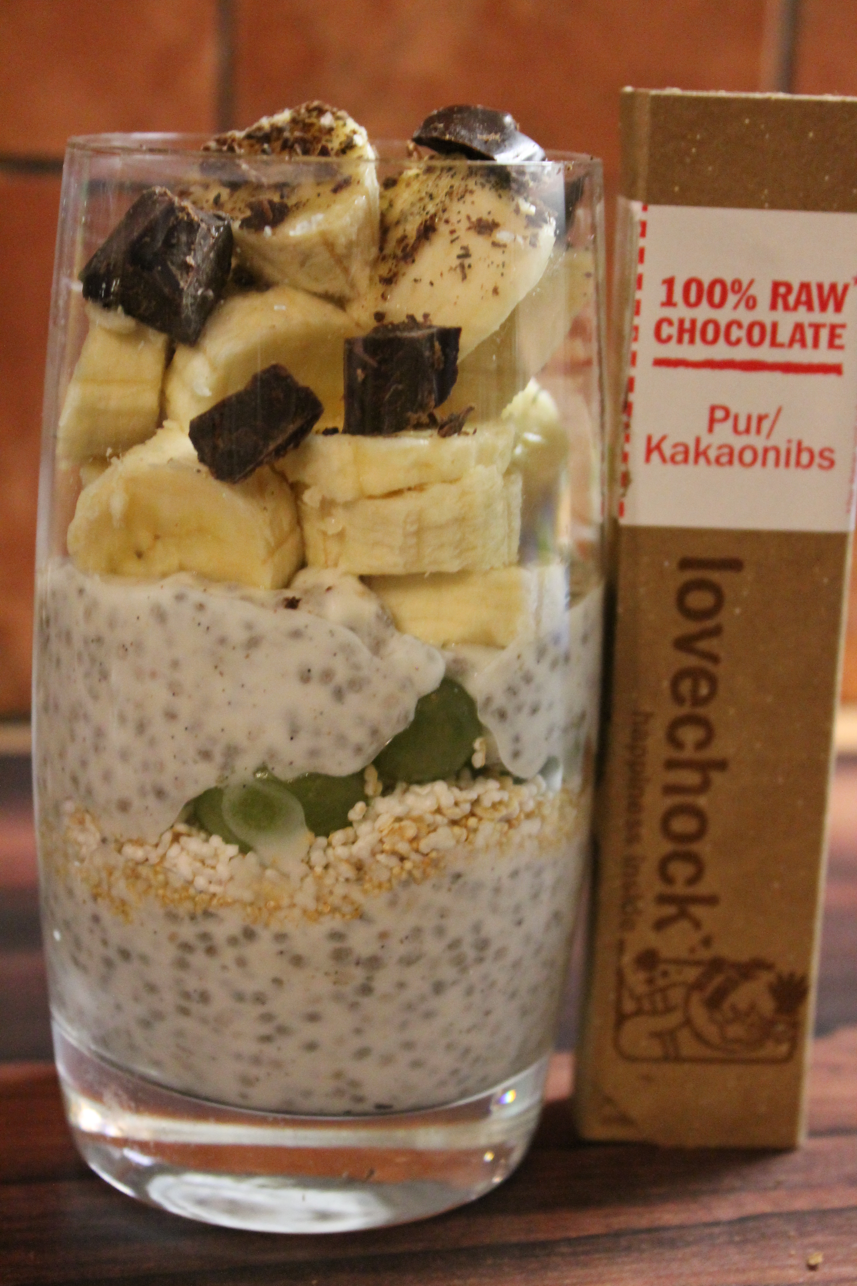 Meinen habe ich mit gepufftem Amaranth, Trauben, Banana und einem Stück der „lovechock“ Schokolade gegessen: Meeega lecker!