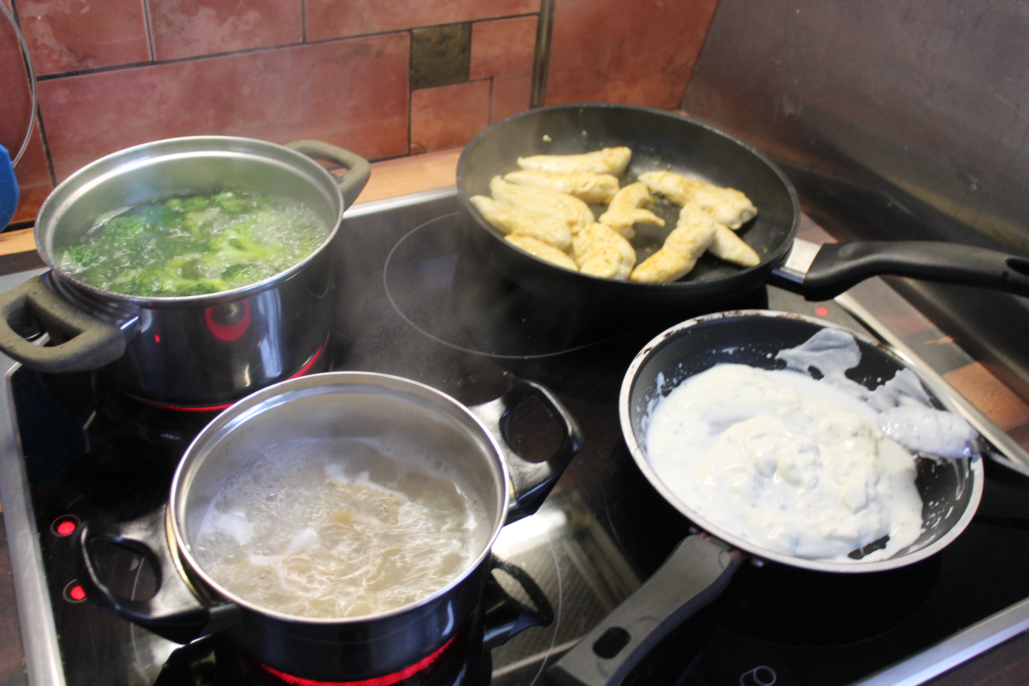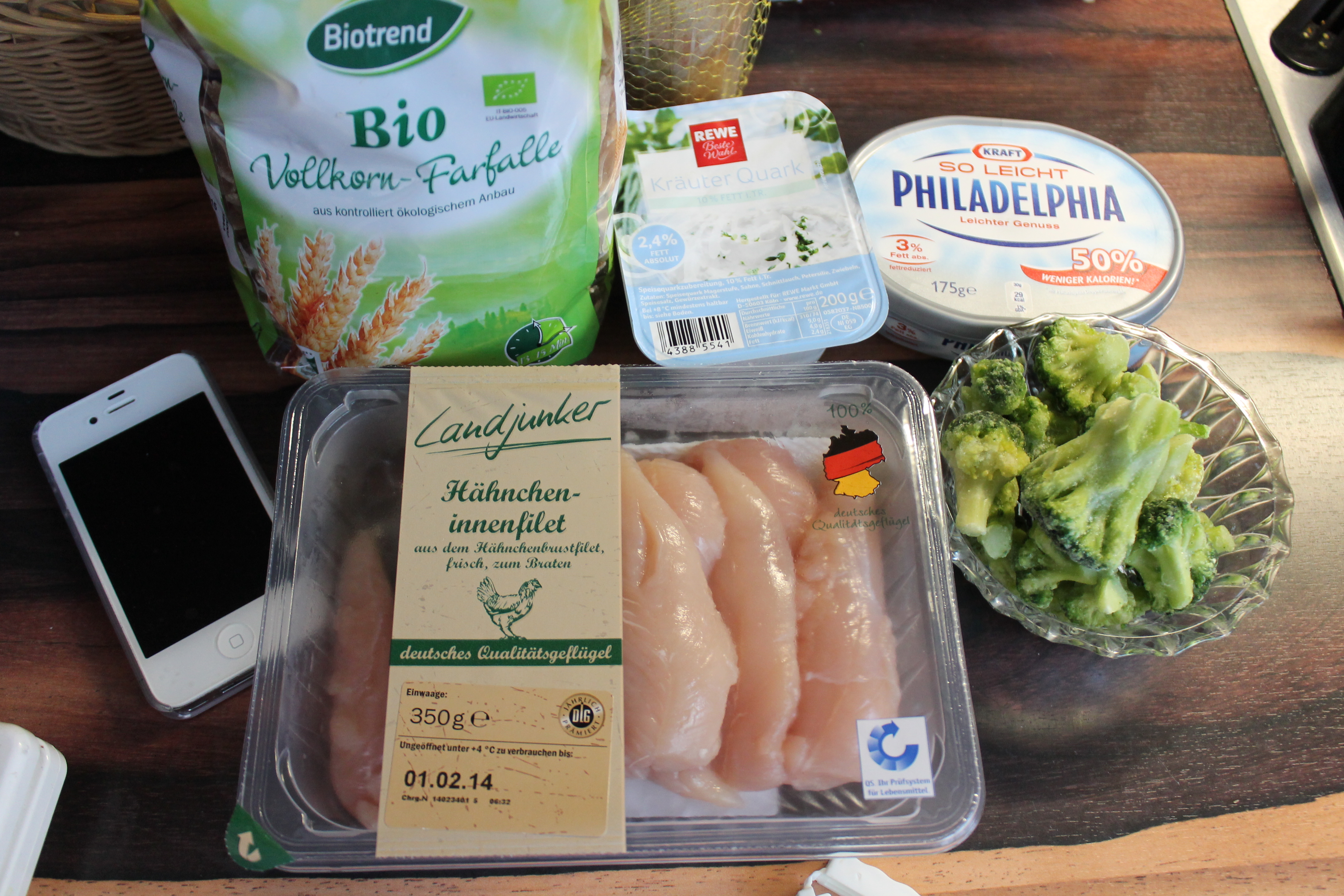 Ihr braucht 50g Vollkornnudeln, 100g Hähnchenbrust, 100g Brokkoli, 30g Philadelphia und 50g Kräuterquark