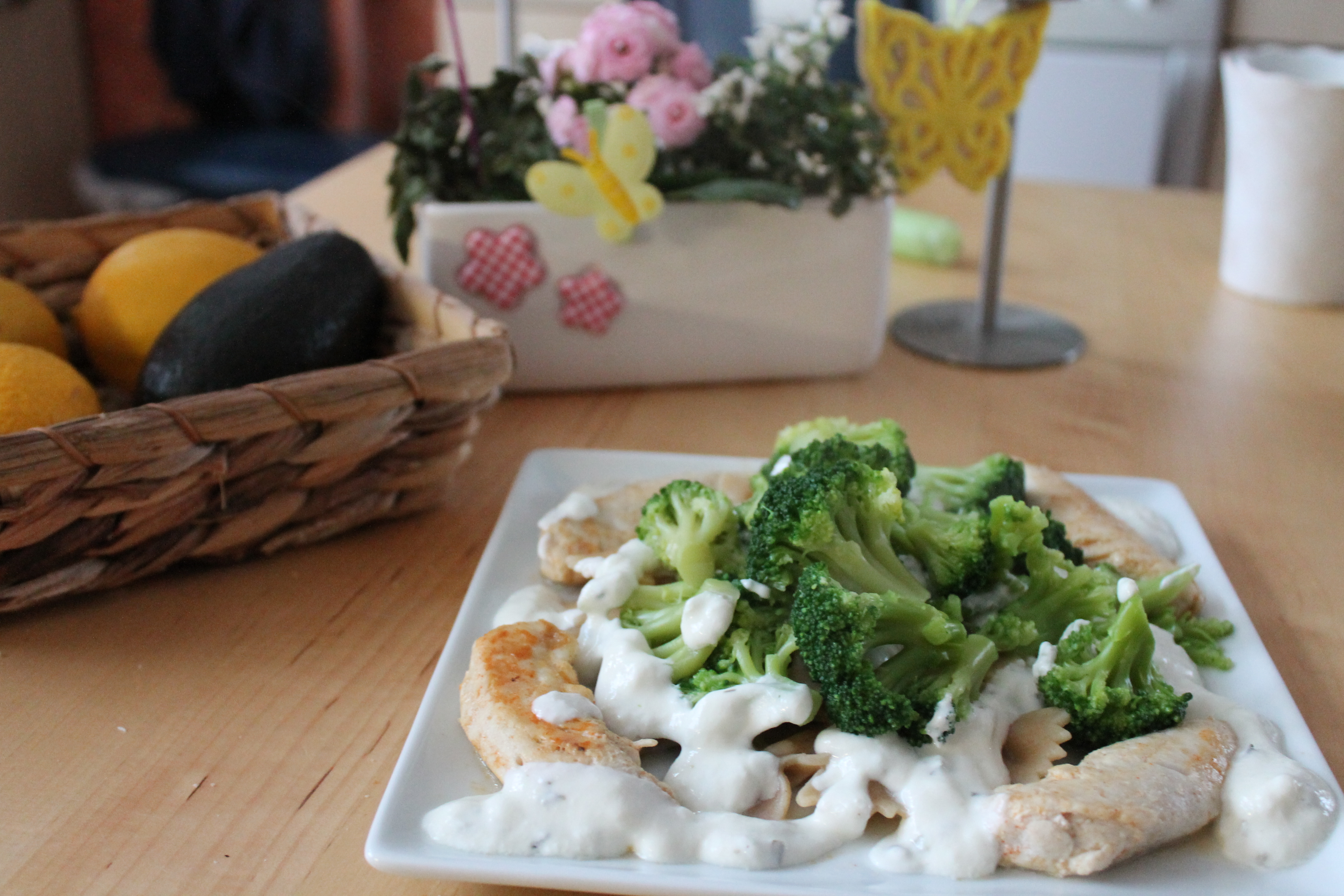 Zum Mittag gab es Vollkornnudeln, Brokkoli, Hühnchen und eine Quark-Kräuter Soße.