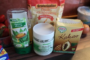 For the cakebase you need 80g wholegrainflour, 1tbsp raw cocoa powder, 3 tbsp coconut oil, 120ml almond milk and 10g agave syrup.