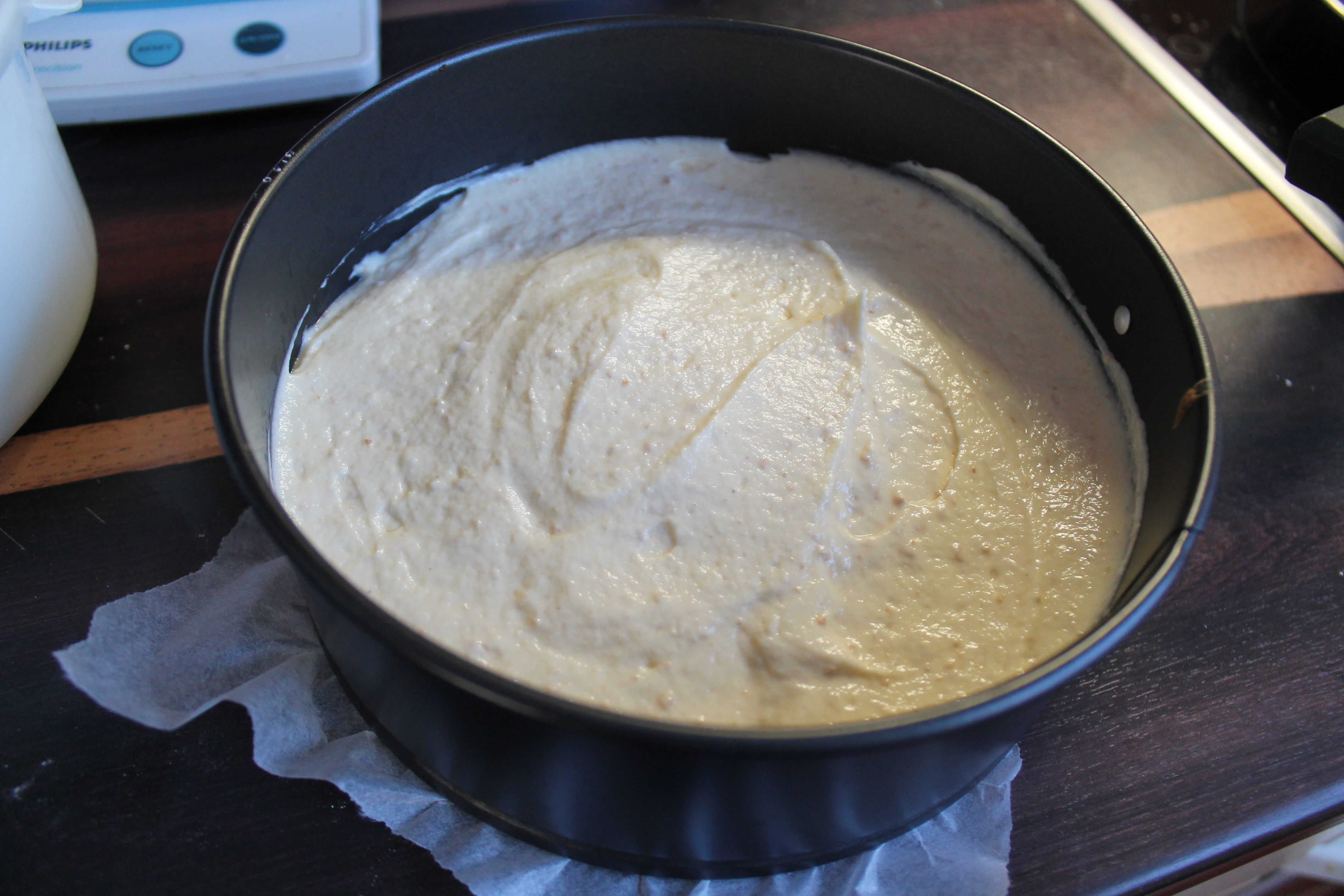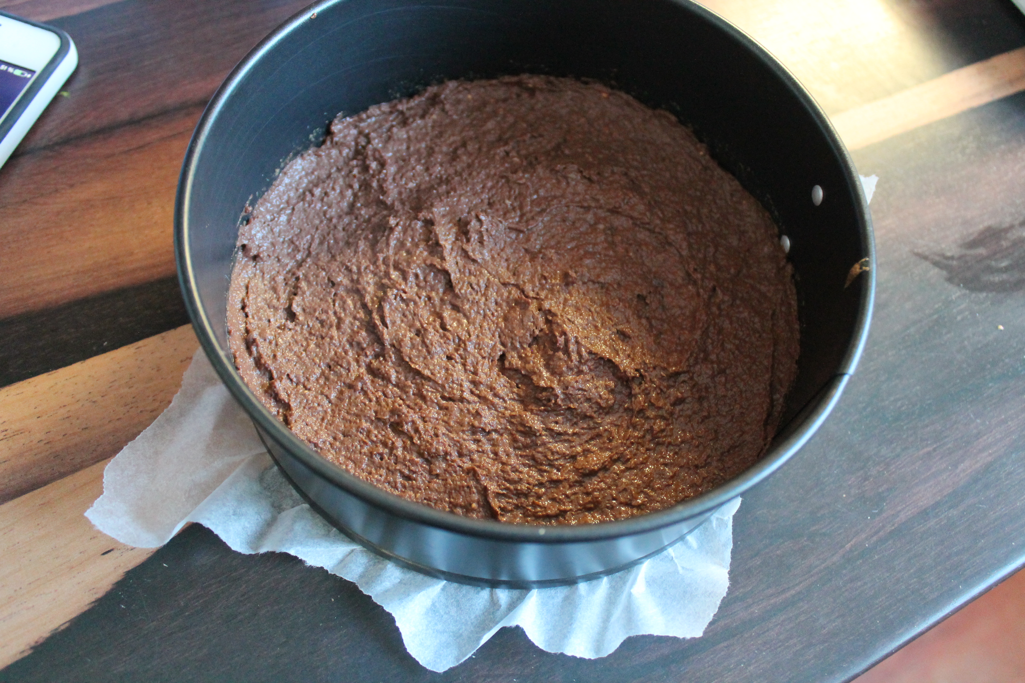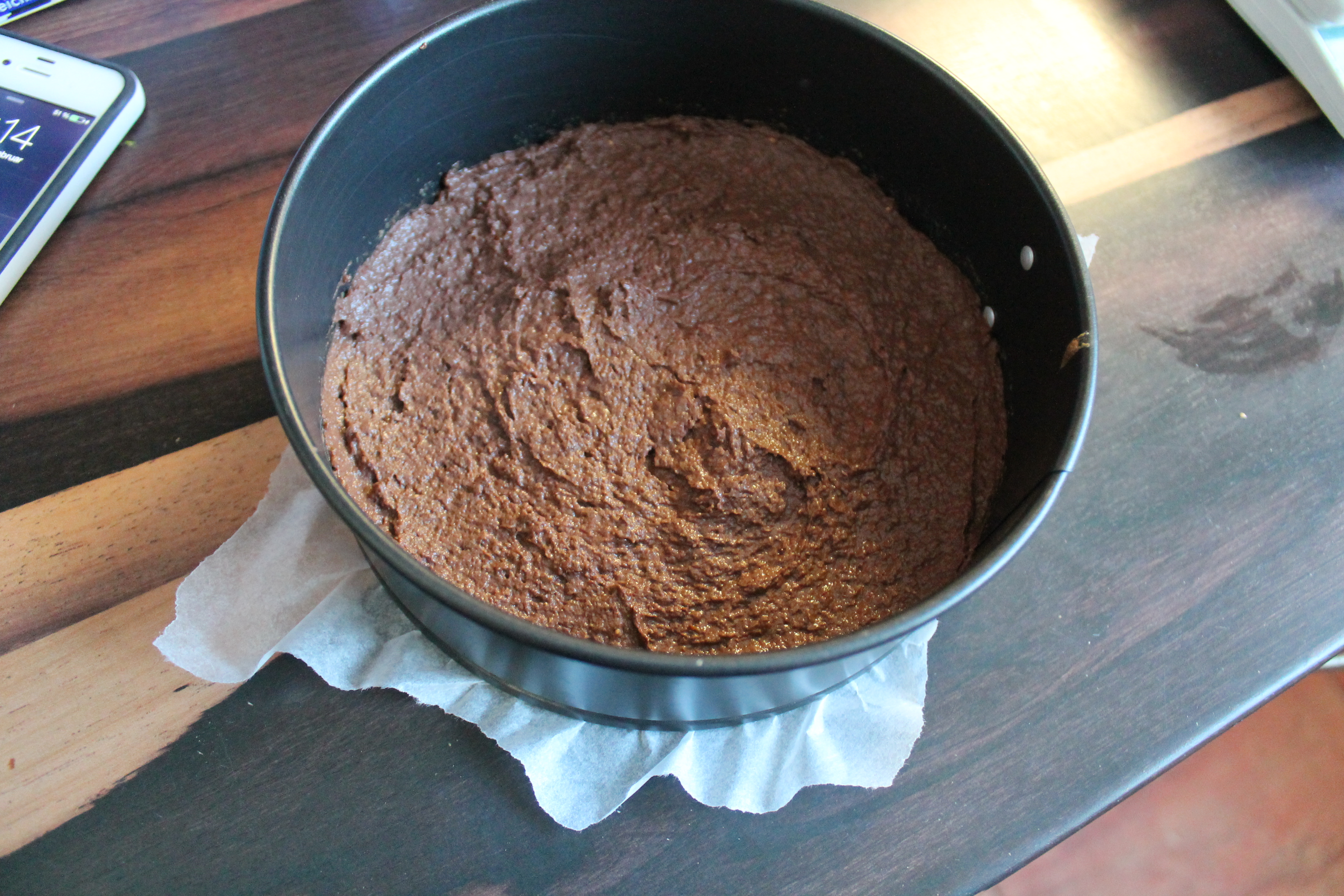 Nun könnt ihr den Kuchen in den Ofen geben! 35-45 Minuten bei 160°C. Einige von euch hatten mir geraten die Ofentür nicht zu öffnen bis die Zeit rum ist, da er sonst zusammenfallen könnte. Meiner ist leicht zusammengesackt, aber die Meinungen im Internet sind einfach so unterschiedlich! Da gibt es so viele Varianten, manche ziehen sich über 3 Stunden hin und die Zeit und Geduld hatte ich einfach nicht :DDas was ich da auf dem Bild mache ist eigentlich nicht sehr empfehlenswert, wie mir im Nachhinein aufgefallen ist. Im Teig befinden sich ja rohe Eier, aber mir ist zum  Glück nichts passiert. 🙂