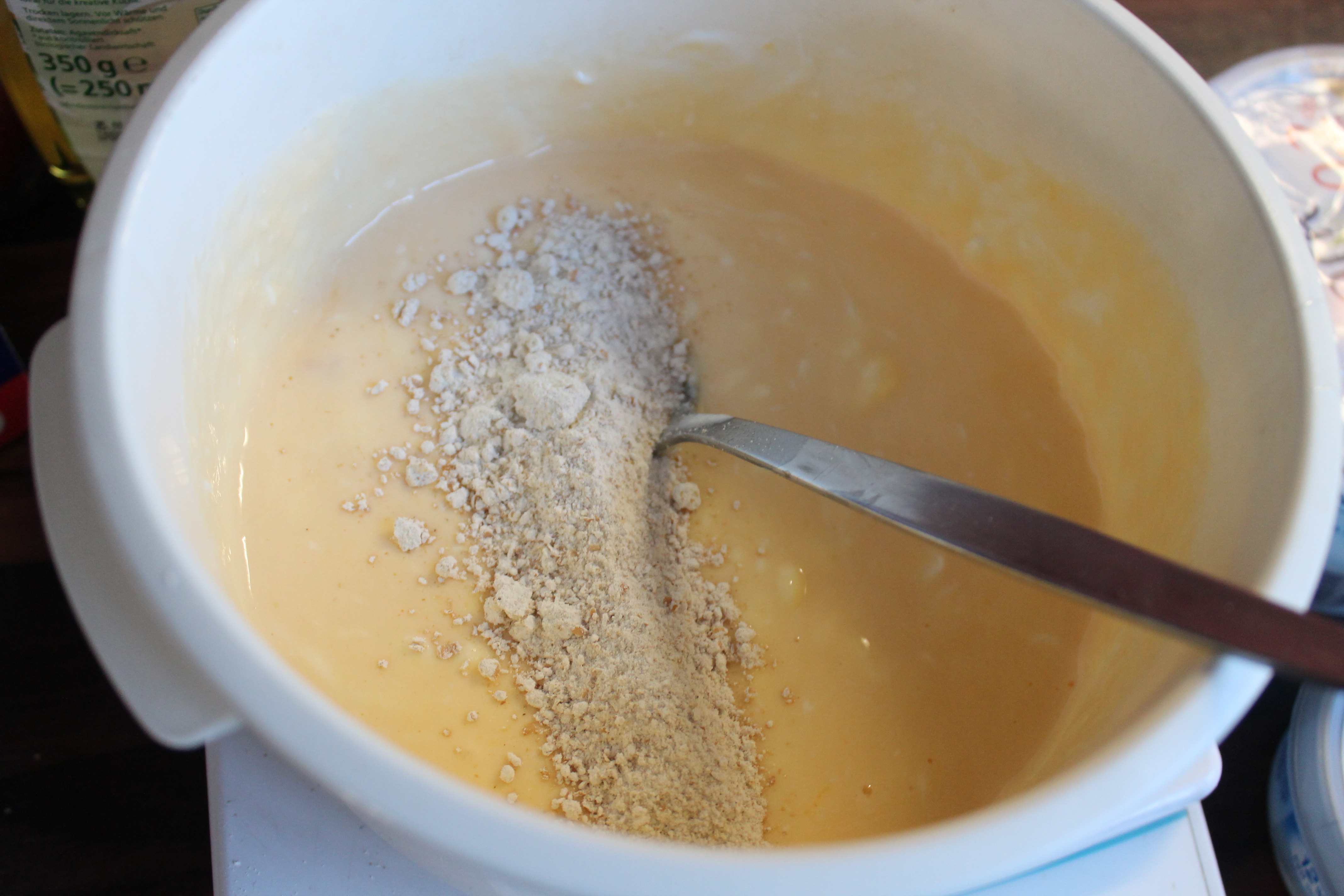 For the bigger part of the cake you mix the curd, creamcheese, egg and eggwhites with one tbsp wholegrainflour and 25g vanilla whey and two tsp baking powder. If you don’t have protein powder at home you should use stevia or agave syrup to make it sweet enough. I didn’t need any other sweetener.