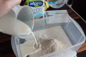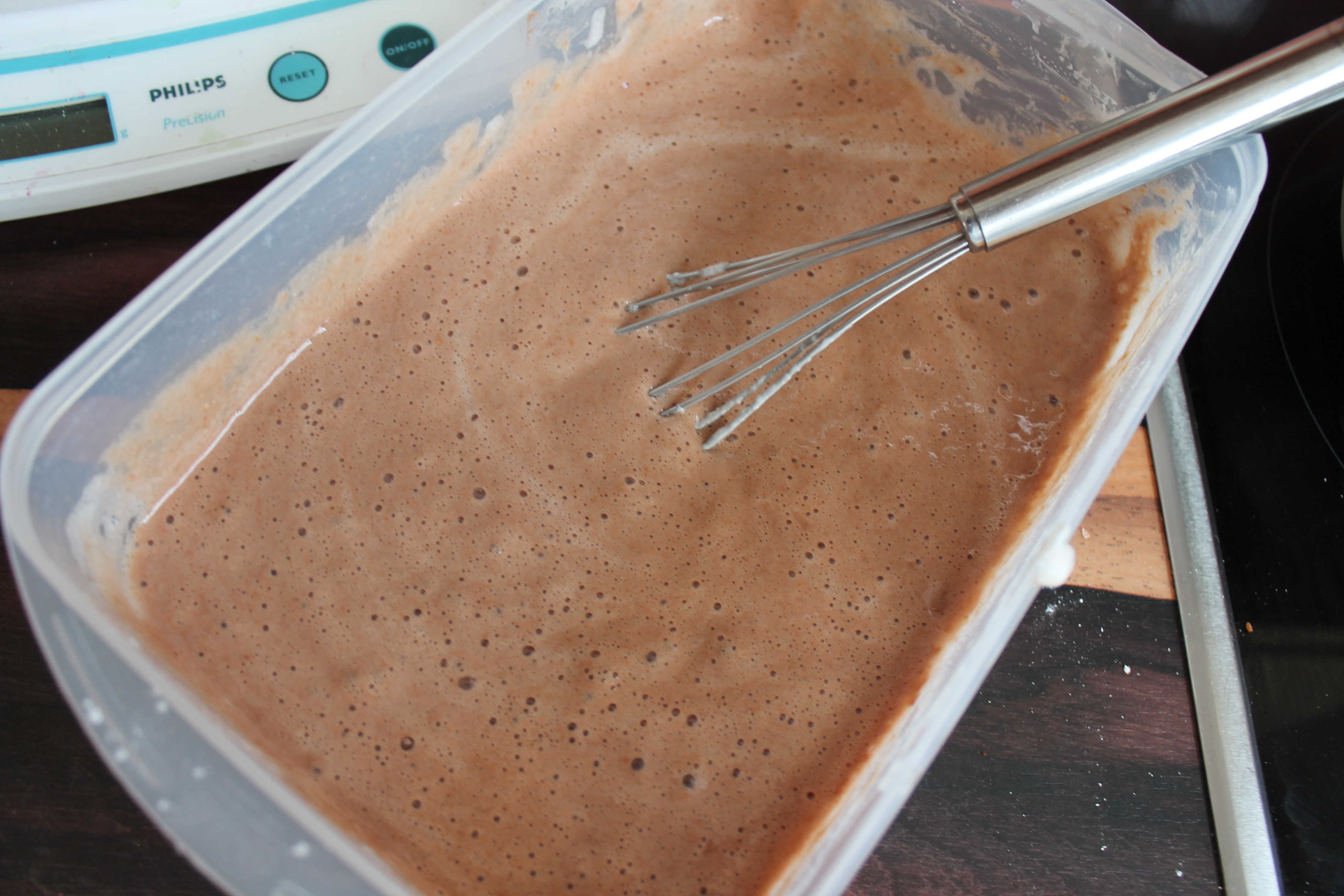 - Mehl, Milch, Whey, ein Ei, Backkakao, Quark und Backpulver vermischen