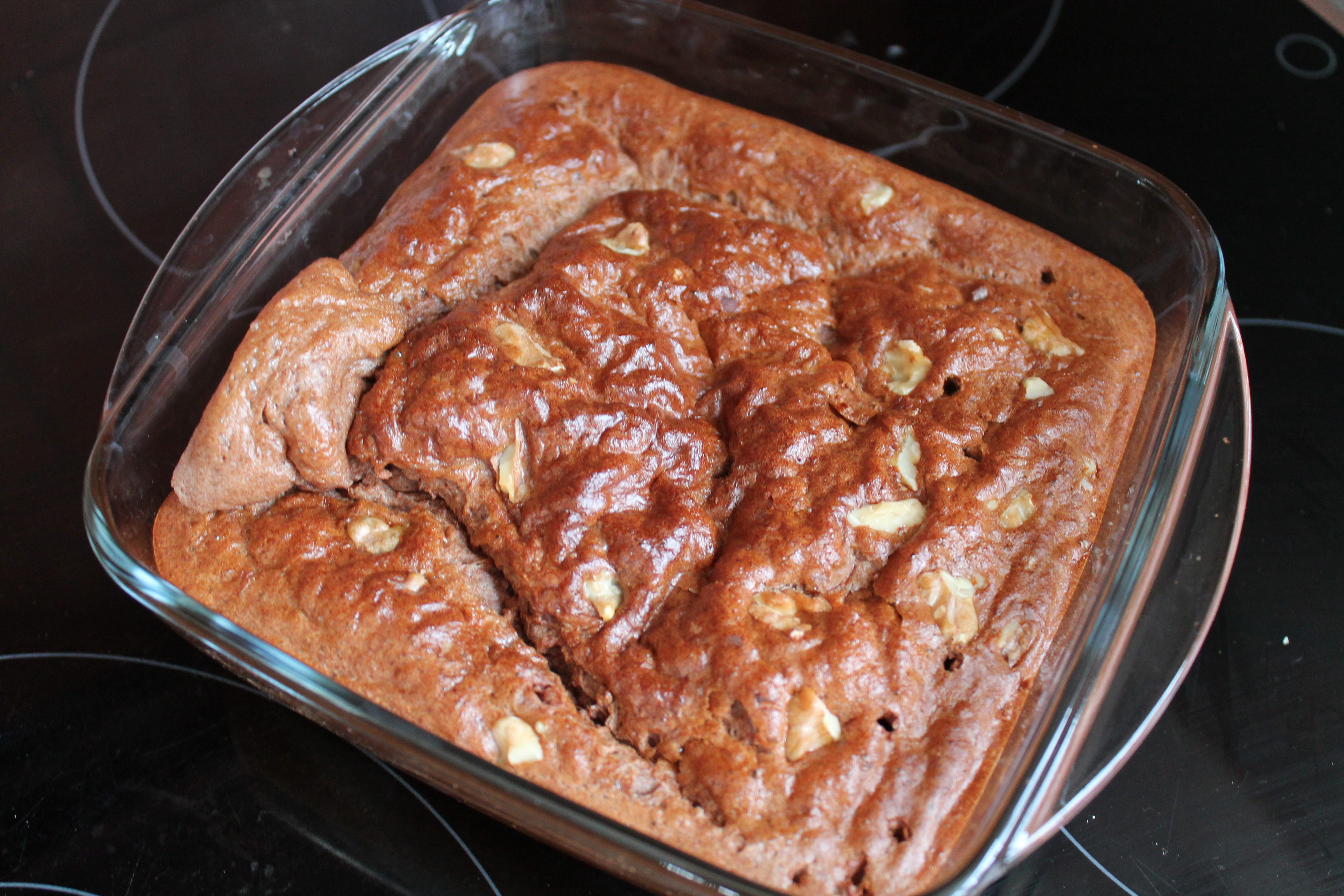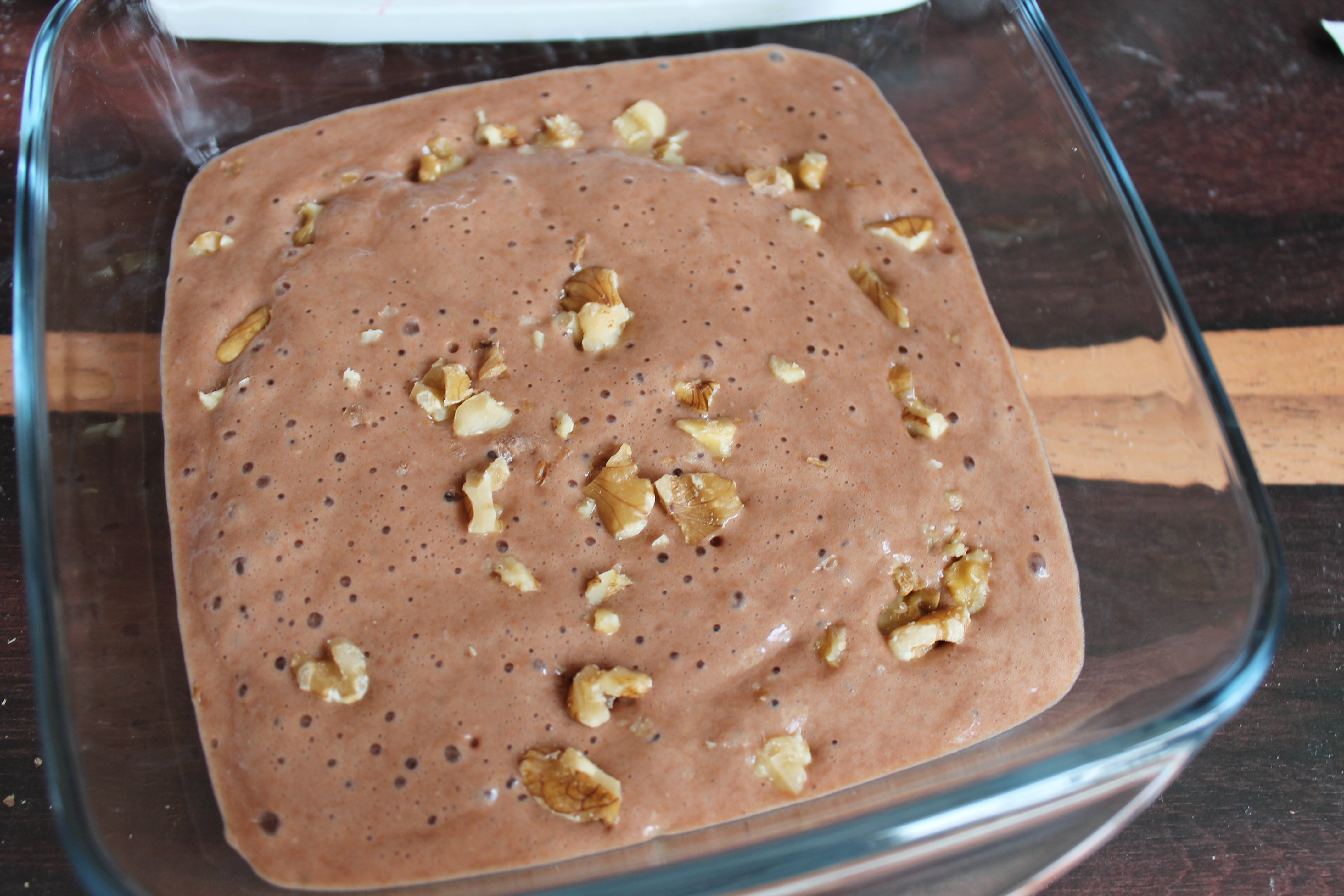 - Teig in eine Backform geben, nach der Hälfte Walnüsse zerkleinern und auf den Teig geben, danach den restlichen Teig darüber geben