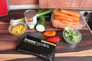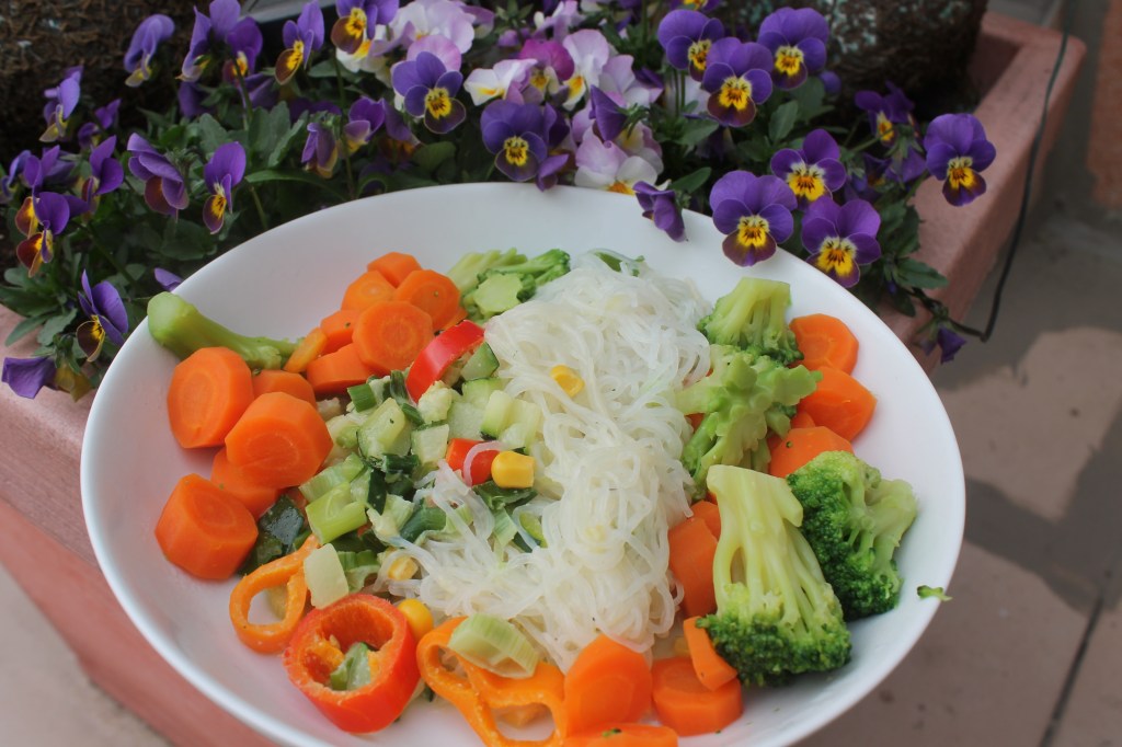 Cut the veggies. Steam the broccoli and the carrots. Wash the fitnessnoodels careful and open the knot.