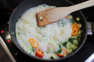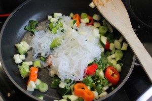 Wenn sie anfangen zu brutzeln gebt das Gemüse hinzu (bis auf Brokkoli und Möhre).