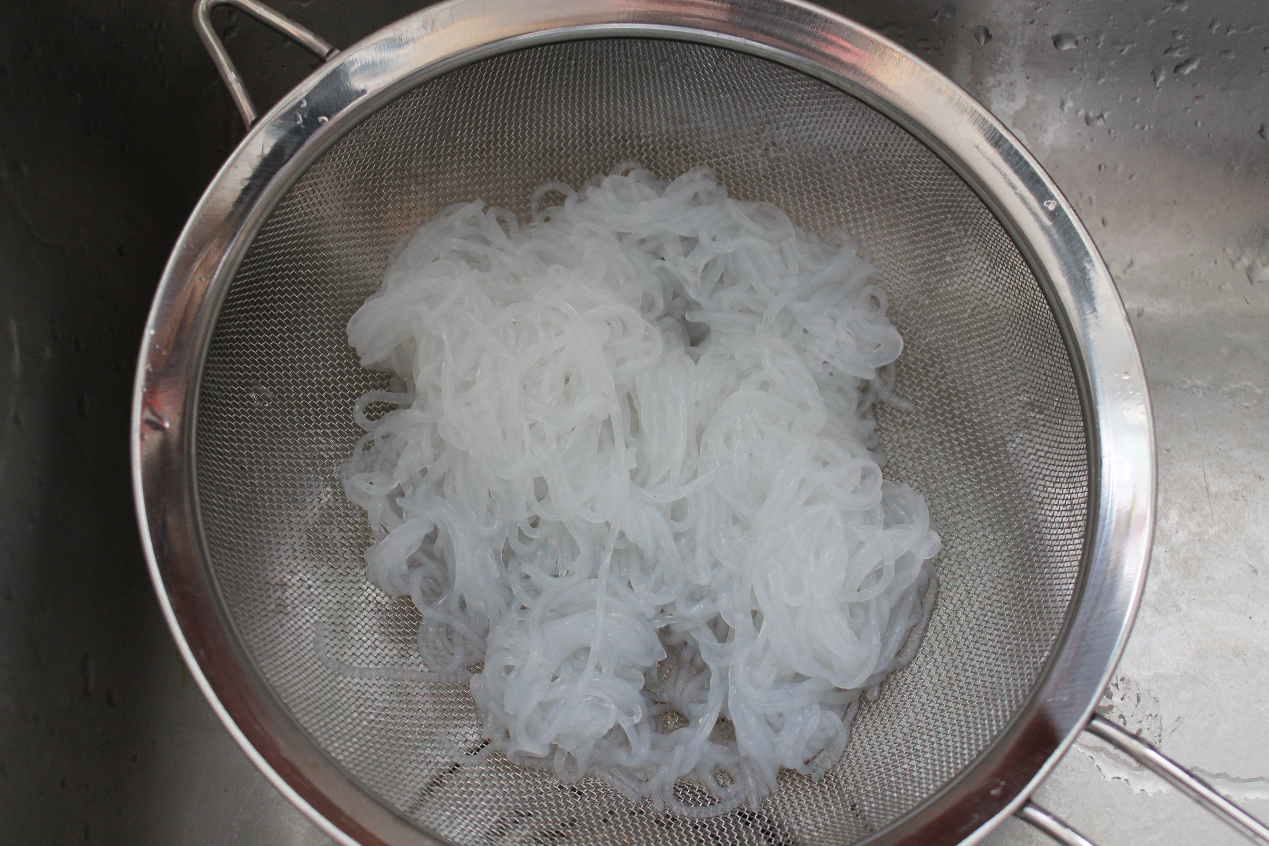 Gebt die Nudeln in ein Sieb und wascht sie sorgfältig ab und löst die Knoten. Wascht sie solange, bis der fischige Geruch verschwunden ist.