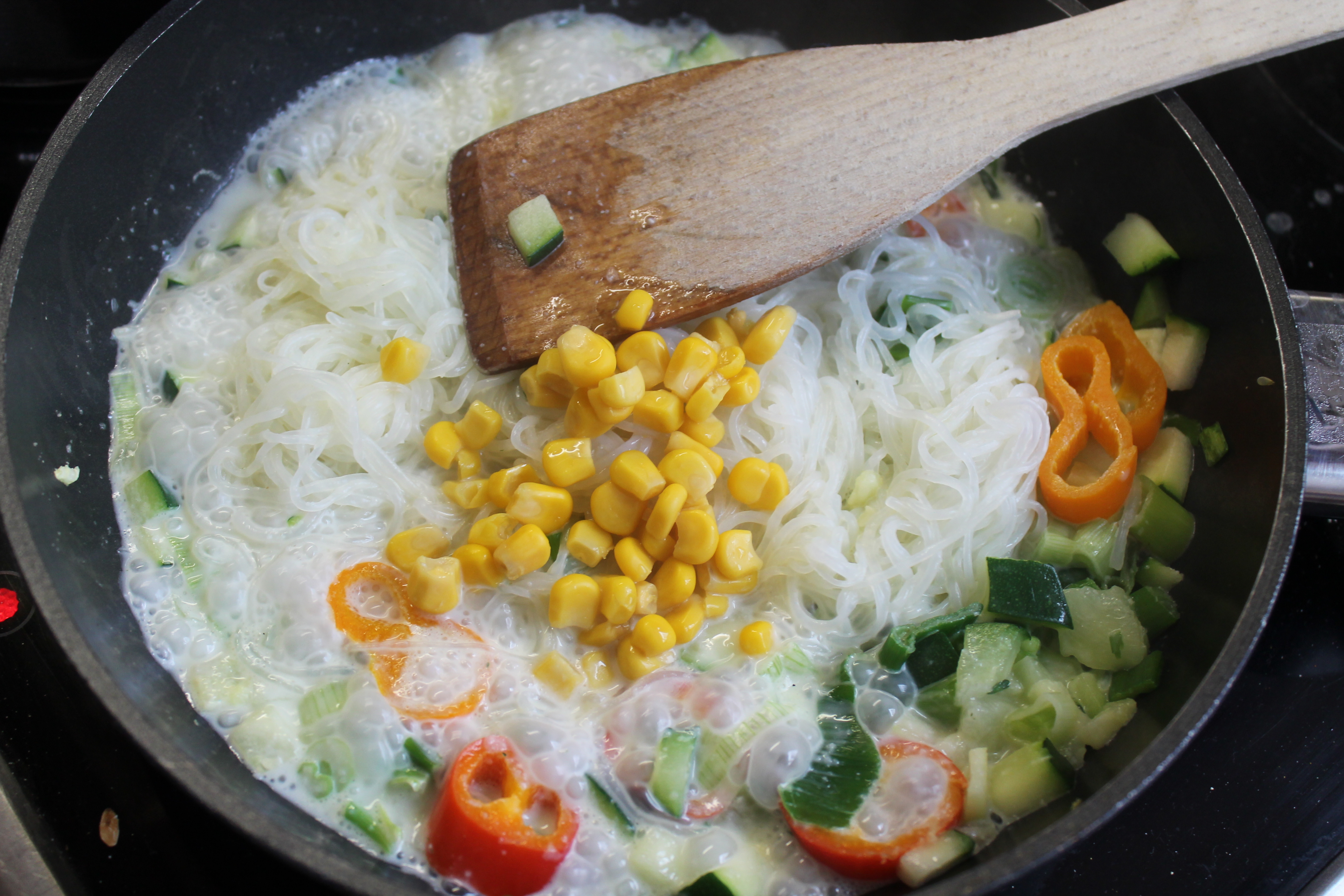 Put them into a non stick pan. Add the veggies except the broccoli, carrots and corn. Add the coconut milk and spices. Now add the corn.