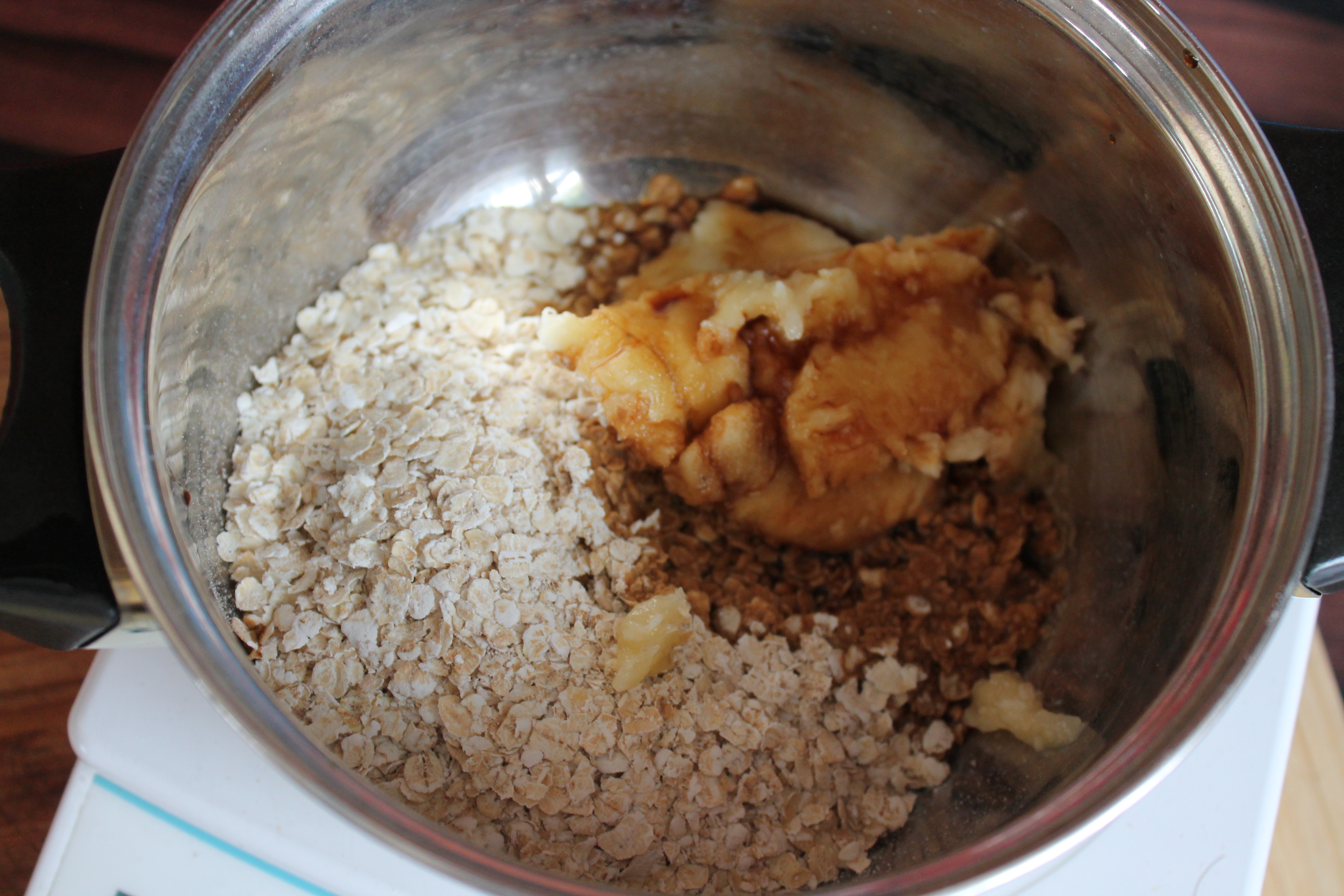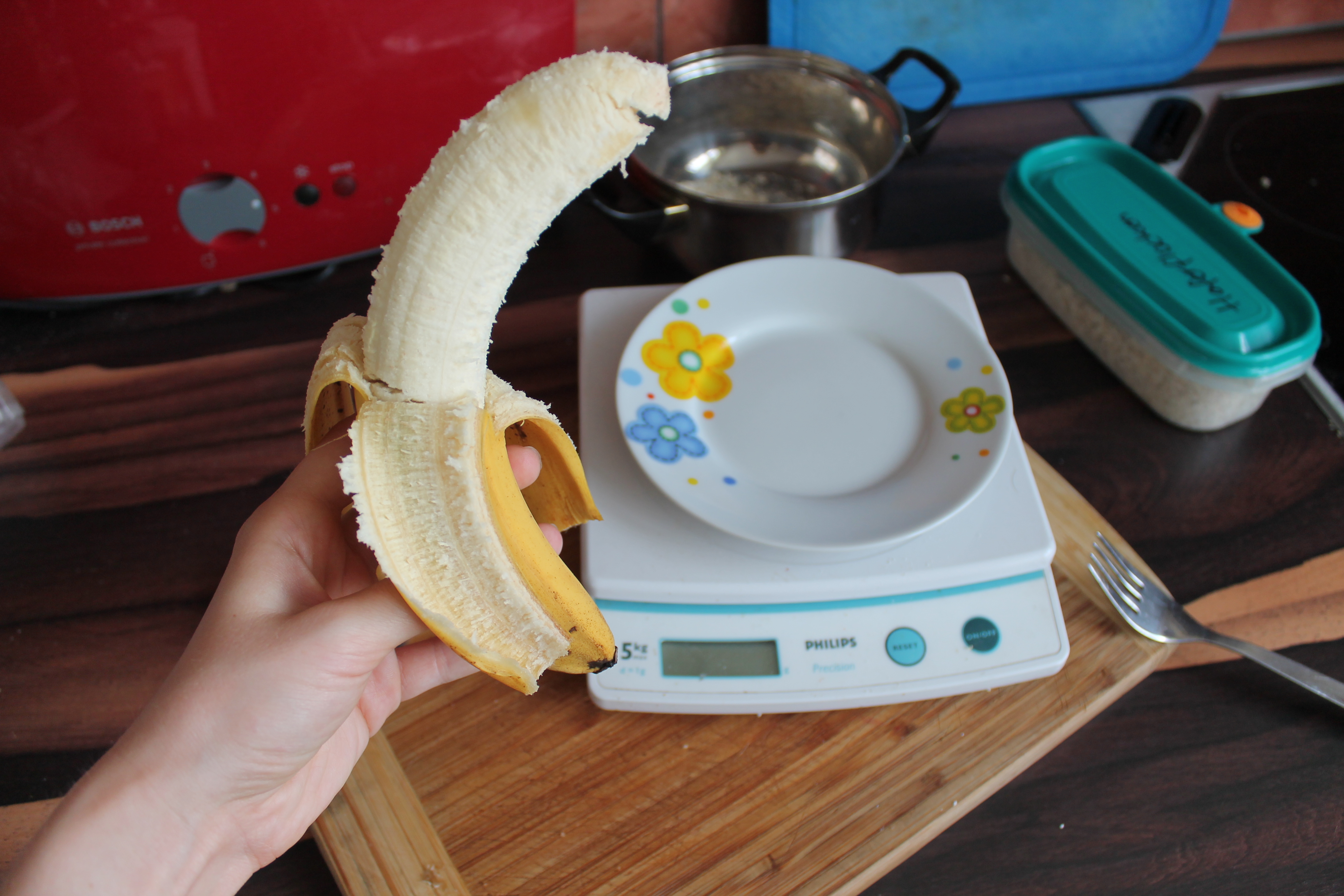 Die Hälfte der Banane zermatschen und in den Topf geben.