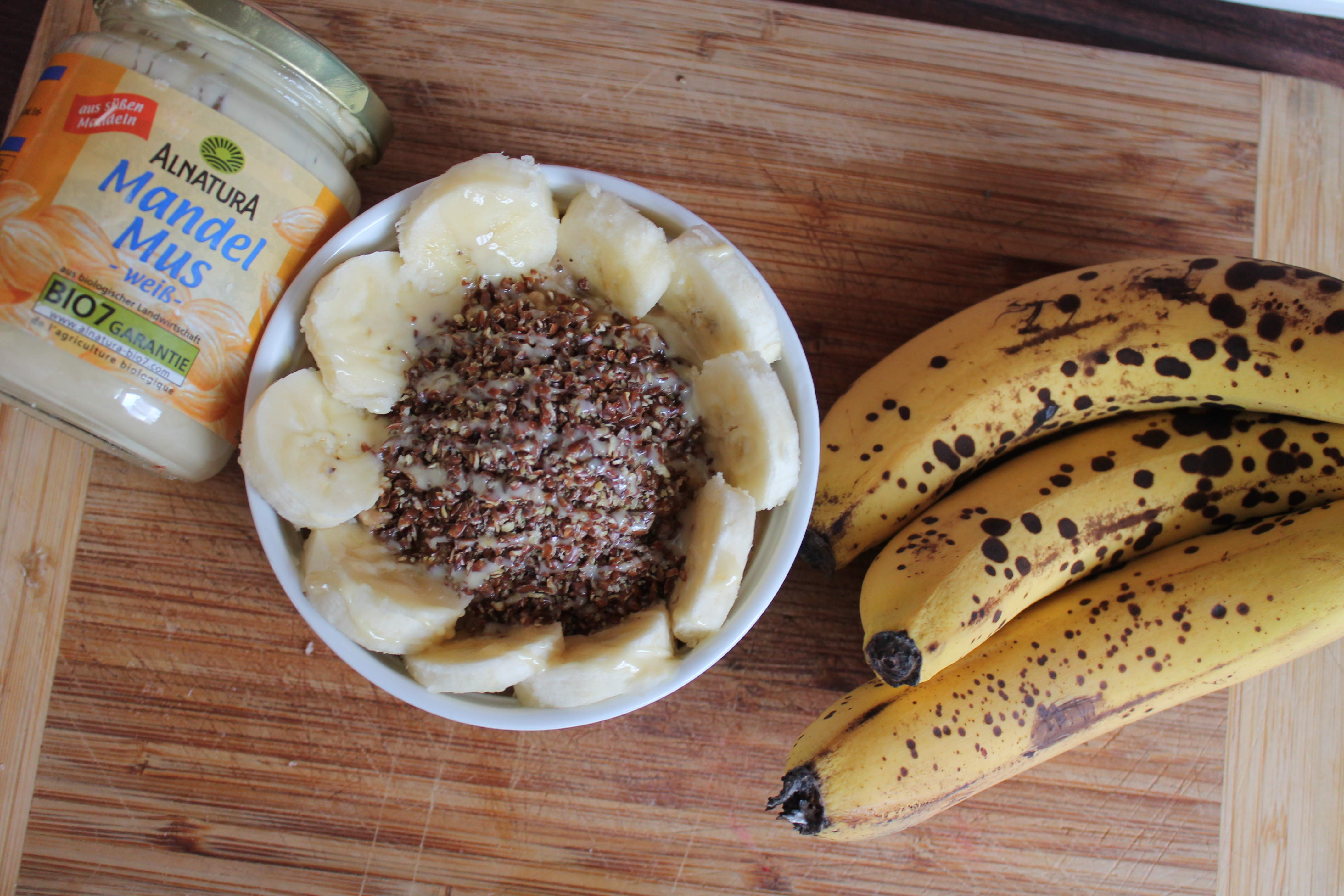 Ich hab den rest der Banane und einen Esslöffel Leinsamen dazugegeben, außerdem einen Schuss Mandelmus.