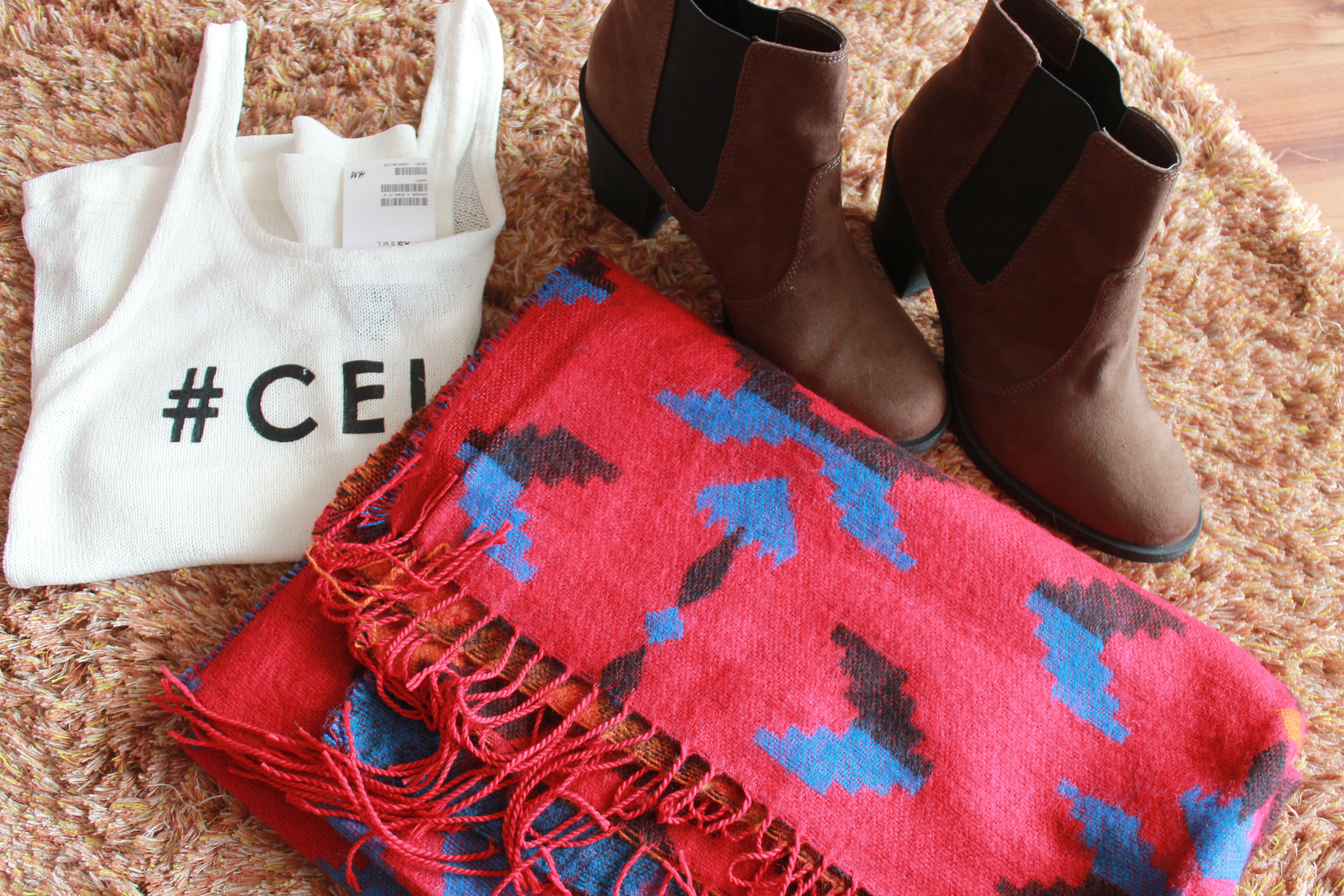 Der Schal kostet 14,99€ und die Schuhe 29,99€. Das Celfie Top kostet 9,99€.