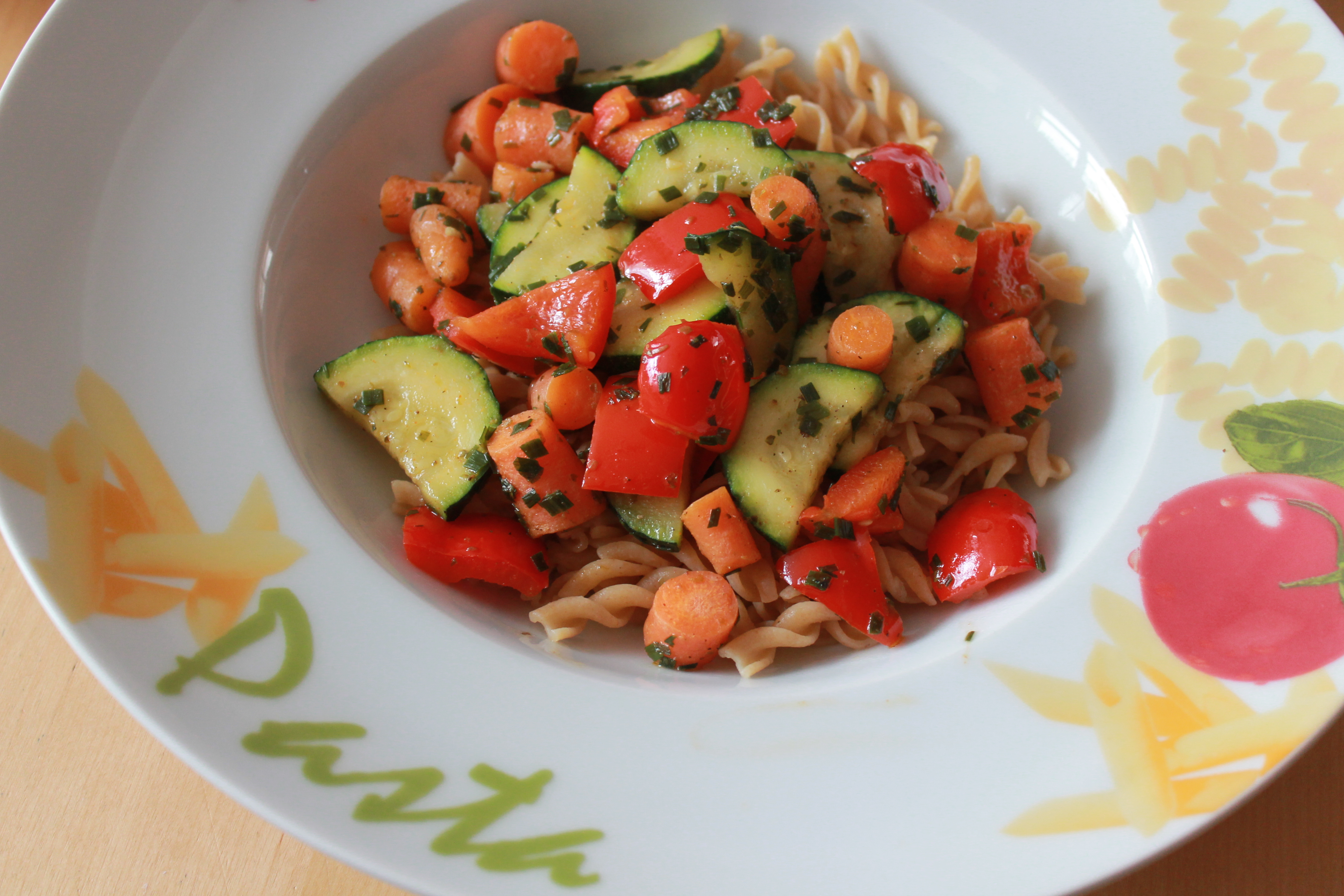 Zum Mittag gab es Vollkornnudeln mit Gemüse und Mailskolben.