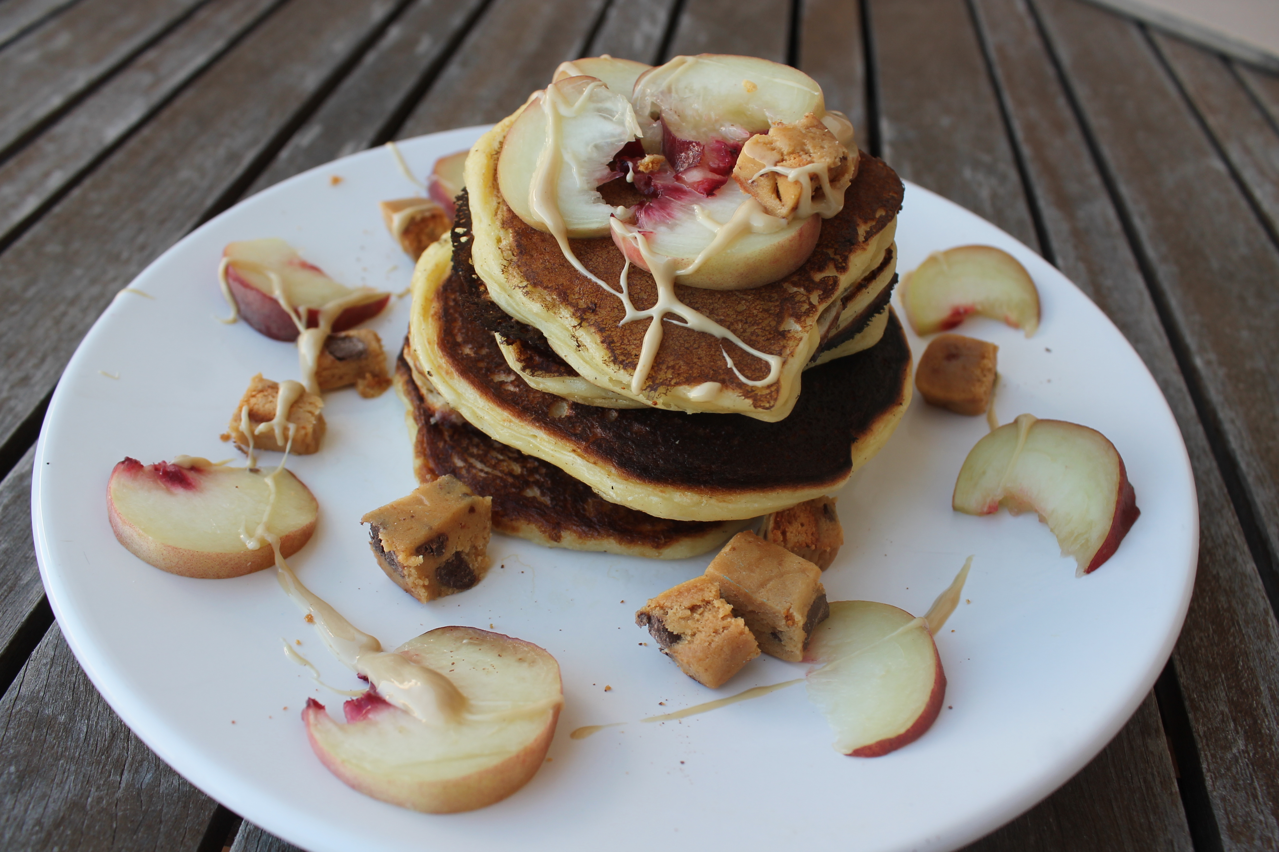 Für die Pancakes habe ich 2 Eier, ungefähr 250g Magerquark, 3 Esslöffel Dinkelmehl, 2 Messerspitzen Backpulver, flüssiges Stevia nach Gefühl und eine gaaaanze Menge Vanille aus der Mühle vermischt. Dann noch 2-3 Tropfen FlavDrops mit Vanille Geschmack und das wars auch schon. Das ganze hab ich dann mit Kokosöl angebraten, dauert etwas länger durch den Quark. Die Konsistenz ist auch ganz anders als meine üblichen Pancakes aber ich mag es total. War mehr ein Experiment, weil ich keine Milch mehr da hatte. Obendrauf kam dann ein S’mores Questbar und Cashew Butter ( meine große Liebe ) plus ein Bergpfirsich. YUMMY!